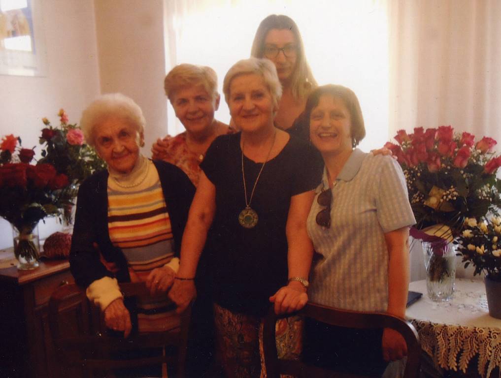 5. U Babci w Nowym Mieście Lubawskim. Od lewej : Babcia, matka chrzestna Brygida, mama Maria, kuzynka Zuzia, Kinga